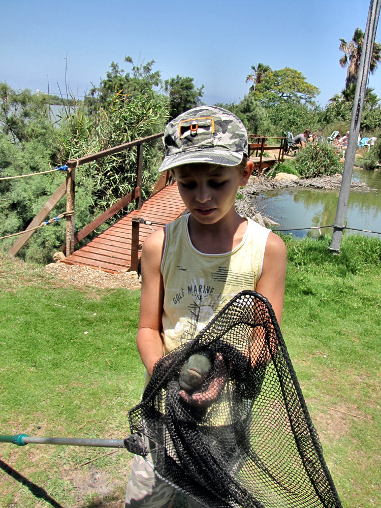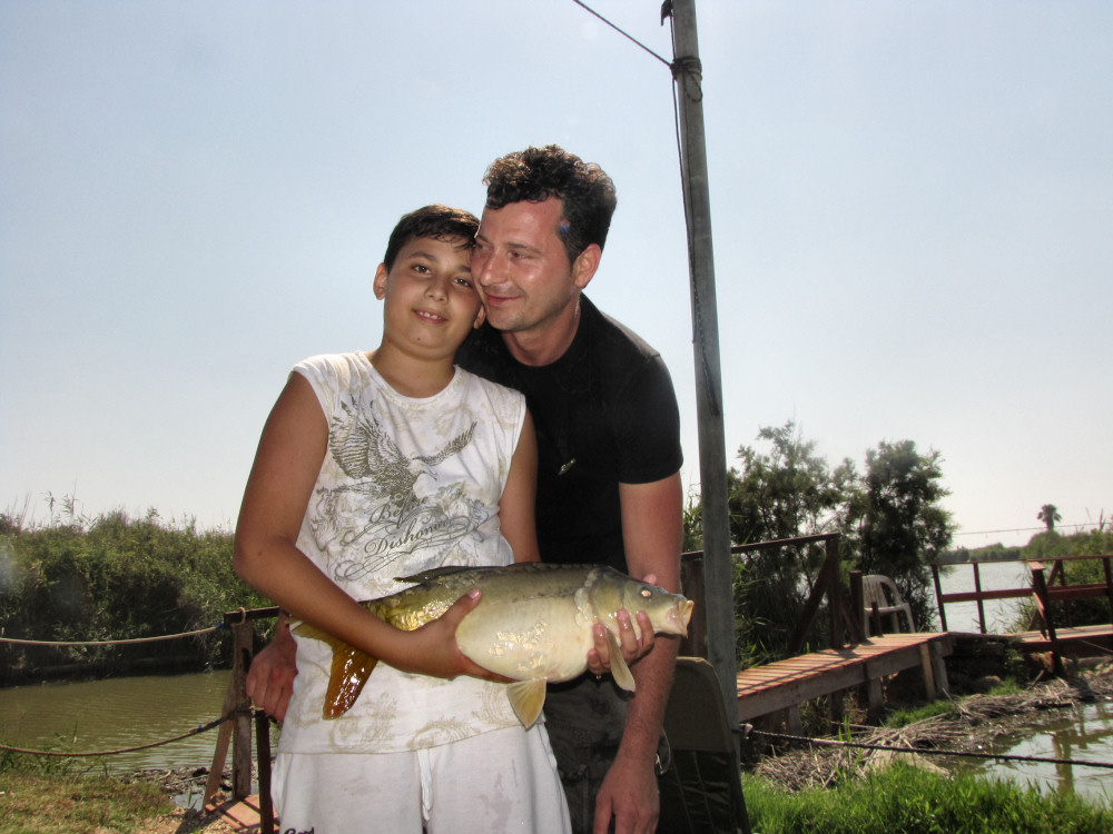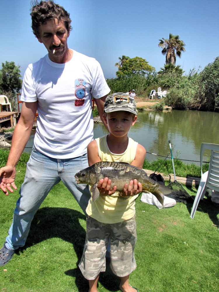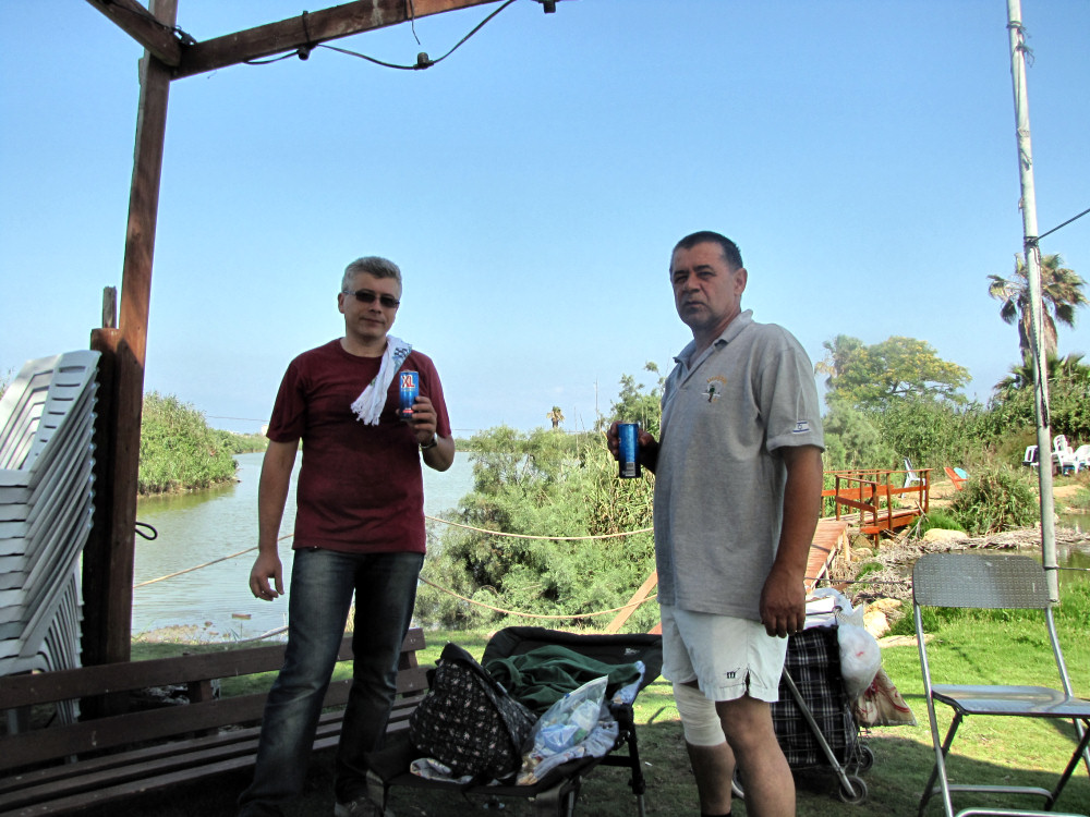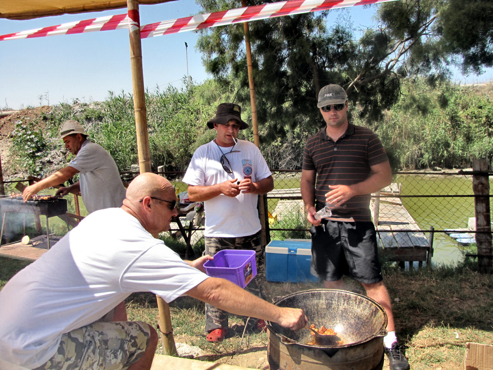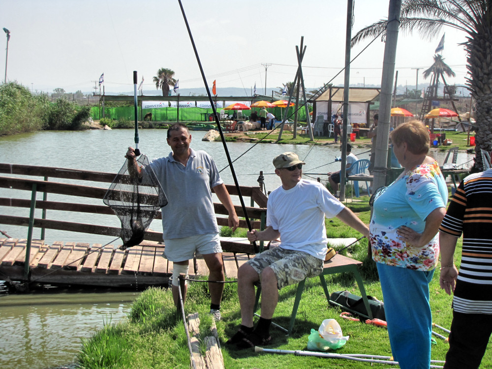 Когда все было готово, Михалыч с Саней сразу рванули к воде, половить рыбку. И вскоре Саня подсек неплохого карпика - причем хозяин парка Офер говорил, что последние несколько недель карп вообще не клюет. Ну это у кого как