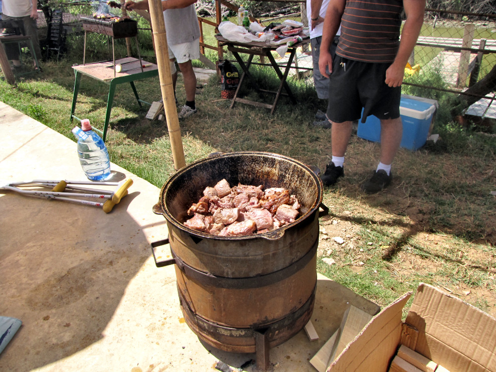 Мент привез казан, и сразу пошла работа - топить печку, готовить ингредиенты. В это время Михалыч начал жарить мясо, чтобы его сразу сьедали мелкими партиями.
