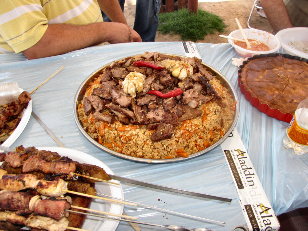 В какой то момент Саша Прайс взял плов под свое чуткое руководство и практически сам довел весь процесс до конца. И вот ароматный продукт уже плывет к столу, где все жадно ждут, когда же блюдо приземлится в пределах досягаемости.