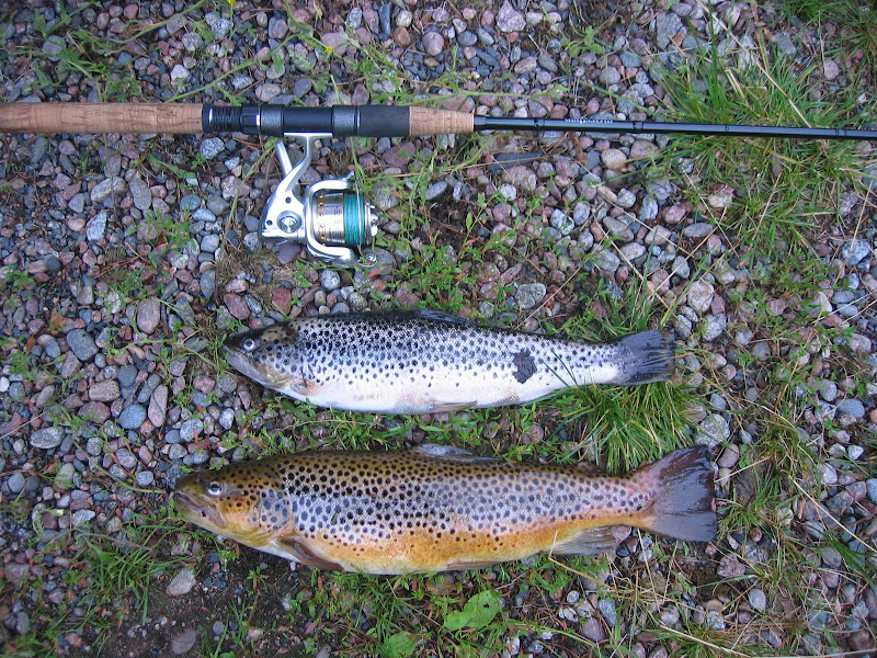 Особенно я был рад тому, что по морской да и по иорданской привычке оставил лидер из флюорокарбона. Он очень помог мне с отцепами, да и с извлечением второй рыбы из воды без подсака (в первый день я его просто забыл). Фины сказали мне, что это таймень, но я сильно сомневаюсь. Посмотрите на нижнюю рыбку, так ли это? У верхней форельки мясо розовое, а у нижней желтое.