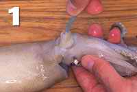 | Начните с продевания крючка, через клапан в голове кальмара так, чтобы острие крючка выходило через клюв кальмара. Это позволит держать крючок строго по центру кальмара. |