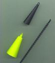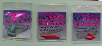 Как вы видели на диаграмме приведенной выше, внутренняя резина крепится к основе второй или третьей секции (с помощью устройства известного как пробка - "bung") и свободно проходя через вершинку удилища (через полую втулку) к коннектору для лески. Простые матчевые и карповые киты (содержащие пробки, втулки и коннекторы, плюс закручиватель для соответственного резинового амортизатора) очень легко собираются и на сегодняшний день их можно приобрести у Henry. Следующие картинки показывают стандартную пробку (обратите внимание, что специальный экстрактор также в комплекте), коннектор для лески и набор тефлоновых втулок (PTFE - teflon bushes). В каждом случае, размер пробки должен быть подобран, основываясь том, какое количество секций будет снабжено резиной (верхние два или три размера пробок); тогда как выбор коннектора и втулки основывается на диаметре и номере резины (более толстая резина требует втулок с большим отверстием)