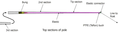 Каждое удилище поставляется с одним или более топ китом. Эти комплекты всего лишь две или три верхние секции удилища, к которым крепится леска. Так-как удилище не снабжено катушкой, "играть" рыбу можно только с помощью растяжения внутренней резины, расположенной в каждом комплекте. Следующий рисунок, от Mike Stone , показывает оснащение эластиком топ кита: