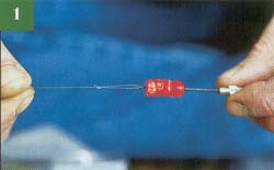 | 1. Насаживайте паштет и трубчатую силиконовую вставку на волос вот так. | 3. В качестве стопора петли волосяной оснастки используйте отрезок прутика. |