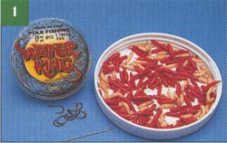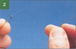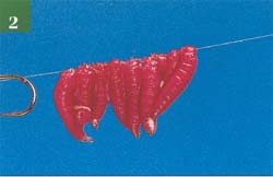 | Нанизайте опарышей один за другим на леску с помощью иголки. | Обмотайте леску вокруг цевья крючка, чтобы получился шарик из опарышей, и привяжите свободный конец лески |