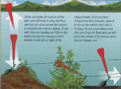 Подтащив поплавок, дайте ему всплыть и отметьте показания. Выполняйте ту же последовательность после каждого перемещения поплавка по дну и вы получите точную картину рельефа дна в том месте, где собираетесь ловить |