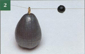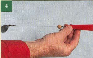 2 Закрепите на основной леске грузило и резиновую бусинку-буфер. |