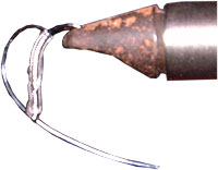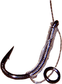 Шаг №1 Вяжите вашу оснастку, как обычную безузловую систему, но вместо того, чтобы оставить "волос" с петелькой на конце, оставьте прямой отрезок лески. Я обычно делаю обмотку почти до изгиба крючка, так что у колечка есть больше места для скольжения. | ![]() |