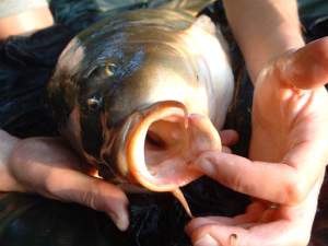 После извлечения крючка приходит время провести беглый медосмотр рыбы. Я всегда осматриваю рыбу с обоих сторон, а также проверяю боковые плавники, хвост и спинной плавник на предмет повреждений или ранок. Также проверяю жаберные крышки, голову и внутреннюю полость рта. Если вы обнаружили какие-либо повреждения неплохо было бы обработать их антисептиком (типа Klinik или Nash Tackle Medi Carp). Капните чуть чуть на пораженный участок. |