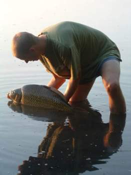 Ок, вы взвесили рыбу и это серьезный экземпляр! Пришло время фотографу запечатлеть этот знаменательный момент - тут есть две разные школы, одна за то, чтобы фотографировать не взирая на погодные условия и время суток, другая, в случае ночной поимки, за то, чтобы положить карпа в специальный карповый мешок и дождаться рассвета. Хранение карпа в мешке это тема, которая вызывает множество споров. Лично я не большой сторонник мешков и предпочитаю насколько это возможно, сделать пару снимков и как можно скорее отпустить рыбу. Если в правильно подготовились и ваша камера закреплена на штативе, вы можете получить пару превосходных ночных снимков, реально отражающих момент. Но если вы хотите сделать это при свете дня и правила водоема позволяют хранение карпа в мешках вы должны всегда помнить несколько моментов - никогда не класть мешок с карпом на мелководье и не делать этого после затянувшейся схватки. Карп получает кислород пропуская воду через жабры и в некоторых ситуациях мешок затрудняет доступ воды к жабрам, так что упаковка истощенного карпа в мешок может привести к его гибели. Та же причина в опасности мелководья - оно менее насыщено кислородом. Я уже не говорю о том, что мешок должен быть прочно закреплен - мысль о дрейфующей в запертом мешке рыбе просто ужасает, так что позаботьтесь о предотвращении вышеописанной кошмарной ситуации. Не забывайте периодически проверять мешок, чтобы убедиться в нормальном его и рыбы состоянии.