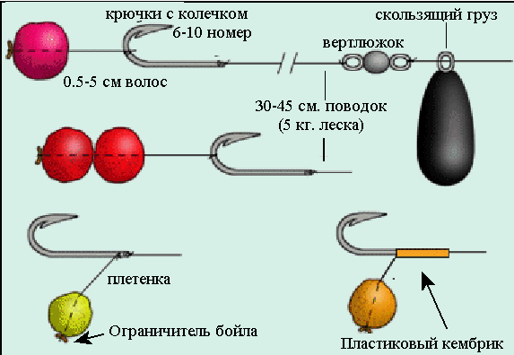 В настоящее время волос обычно сделан из прекрасного нейлона 0.45 кг - 0.68 кг, который колеблется от 6 мм до 8 см в длину. Чем большую рыбу Вы ожидаете, тем длиннее должен быть волос, из-за большего расстояния между губами и зубами карпа. Карп всасывает наживку, а за ней следует крючок. Крючек с изгибом облегчает подсечку.
