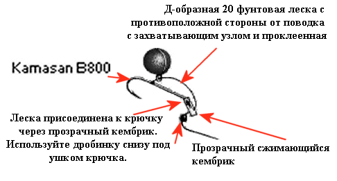 Другая снасть, спроектированная мной и которой я люблю пользоваться, называется "Кривой крючок" и заключается в радикальном изменение формы крючка. Этот крючок дает удивительный эффект, попадая рыбе в рот. Он начинает вращаться, при движении карпа в сторону от груза, несмотря на то что ведет себя деликатно, когда всасывается рыбой вместе с наживкой. Он является незаменимым в местах, где рыба имела контакт с рыбацкими снастями, имеющими тенденцию распугивать рыбу. Когда я задумал эту снасть, 2 года назад, только я и мой друг Грехем Милс использовали ее со снастями, которые были хороши в то время, и были поражены немедленными положительными результатами использования "Кривого крючка". Он обошел другие снасти в отношении 5 к одному, и я должен добавить, мы ловили в довольно сложных озерах на Северо-Западе Англии.