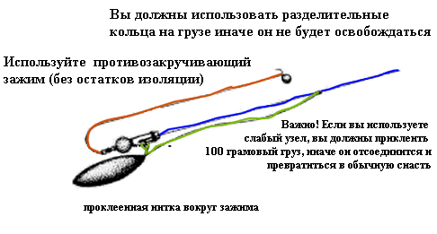 Вы используете 3 унцевое грузило, прикрепленное 5 мл кольцом. Это позволяет грузилу отцепиться от анти-зажима, в момент удара об воду. Это стоит Вам грузила и кольца при каждом броске, но Вы также можете использовать снасть альтернативным способом, используя 3 унцевое грузило, прицепленное к главной леске 4-фунтовой нейлоновой, слабой леской. Это делает две вещи - прежде всего Вы не теряете грузило, во-вторых, меняя длину слабой лески, Вы можете выбрать, как далеко сможет уплыть рыба с наживкой прежде чем она почувствует вес грузила. Рыба обычно хорошо засекается и впадает в панику прежде, чем она натягивает леску с большим грузилом. Свяжите слабую связь с главной леской с помощью скользящего стопорного узлоа.