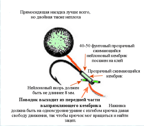 Я пользуюсь этой снастью последние 2 года и могу с уверенностью сказать, что она уловистее многих других оснасток в одинаковых условиях. Принцип работы снасти в устремлении вперед. Его действие подобно корабельному якорю. Если вы представите себе корабельный якорь без крестовины, и как он падает вниз, вы поймете, что он не сможет зацепиться за дно. Он будет просто волочиться по нему одной плоскостью. Соответственно, крестовина из нейлона 40-50 фунтов, уложенная поперек цевья карпового крючка выполняет такую же роль во рту карпа, после всасывания им, как крестовина якоря на дне моря. Смотри Рис А.