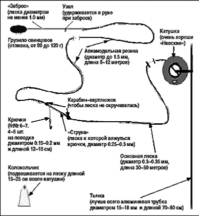 Очень легко изготавливается, служит много лет (кроме самой резинки, которая требует замены после 3-х - 5-ти рыбалок). Стоит немного, работает хорошо, забрасывается на 35 - 40 метров. Общее устройство видно из рисунка. При ловле леску предварительно раскладывают на берегу на чистом месте или на куске брезента, полиэтилена и т.п. Для заброса раскручивают над головой (будьте очень внимательны, чтобы никого из соседей не зацепило) и с силой бросают перед собой в воду. После заброса излишек лески подматывается на катушку. Это нужно делать через 15 - 20 минут, когда груз всосется в ил. В противном случае груз при подмотке "выползет". На струну можно крепить кормушку (например, спираль для мамалыги или мякиша), можно и кусочек жмыха петлей. Вариантов изготовления и работы с резинкой множество. Удобна тем, что забрасывается только один раз в начале рыбалки, к минусам можно отнести то, что невозможно легко менять место ловли. Сторожком служит легкий колокольчик. Чтобы резинка служила дольше, необходимо узлы на ней перевязывать после каждой рыбалки. |